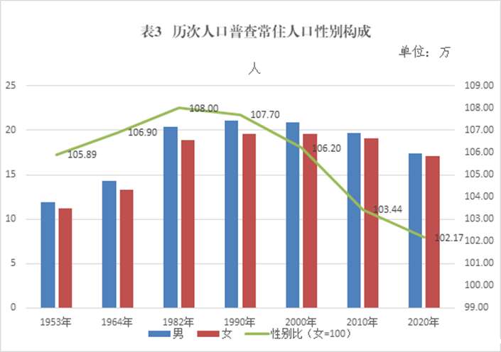 全县常住人口中,男性人口为174319人,占50.54%;女性人口为170616人,占49.46%。总人口性别比(以女性为100,男性对女性的比例)由2010年第六次全国人口普查的103.44下降为102.17。