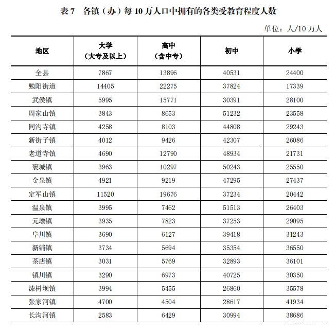 全县常住人口中,拥有大学(指大专及以上)文化程度的人口为27136人;拥有高中(含中专)文化程度的人口为47931人;拥有初中文化程度的人口为139806人;拥有小学文化程度的人口为84164人(以上各种受教育程度的人包括各类学校的毕业生、肄业生和在校生)。与2010年第六次全国人口普查相比,每10万人中拥有大学文化程度的由4407人增加为7867人;拥有高中文化程度的由14071人下降为13896人;拥有初中文化程度的由42331人下降为40531人;拥有小学文化程度的由28356人下降为24400人。