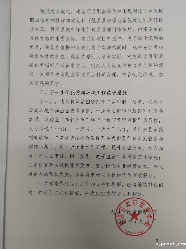 三、加快对建设项目配套绿化工程的验收。主管部门应在接到单位验收申请后,在规定的时限内组织验收,不能等到年底或集中批量验收。这样拖时长,效率低,项目建设单位等不起。主管部门要改变作风,主动联系,主动作为,把管理和服务有机结合,为经营主体创造更好的发展环境。