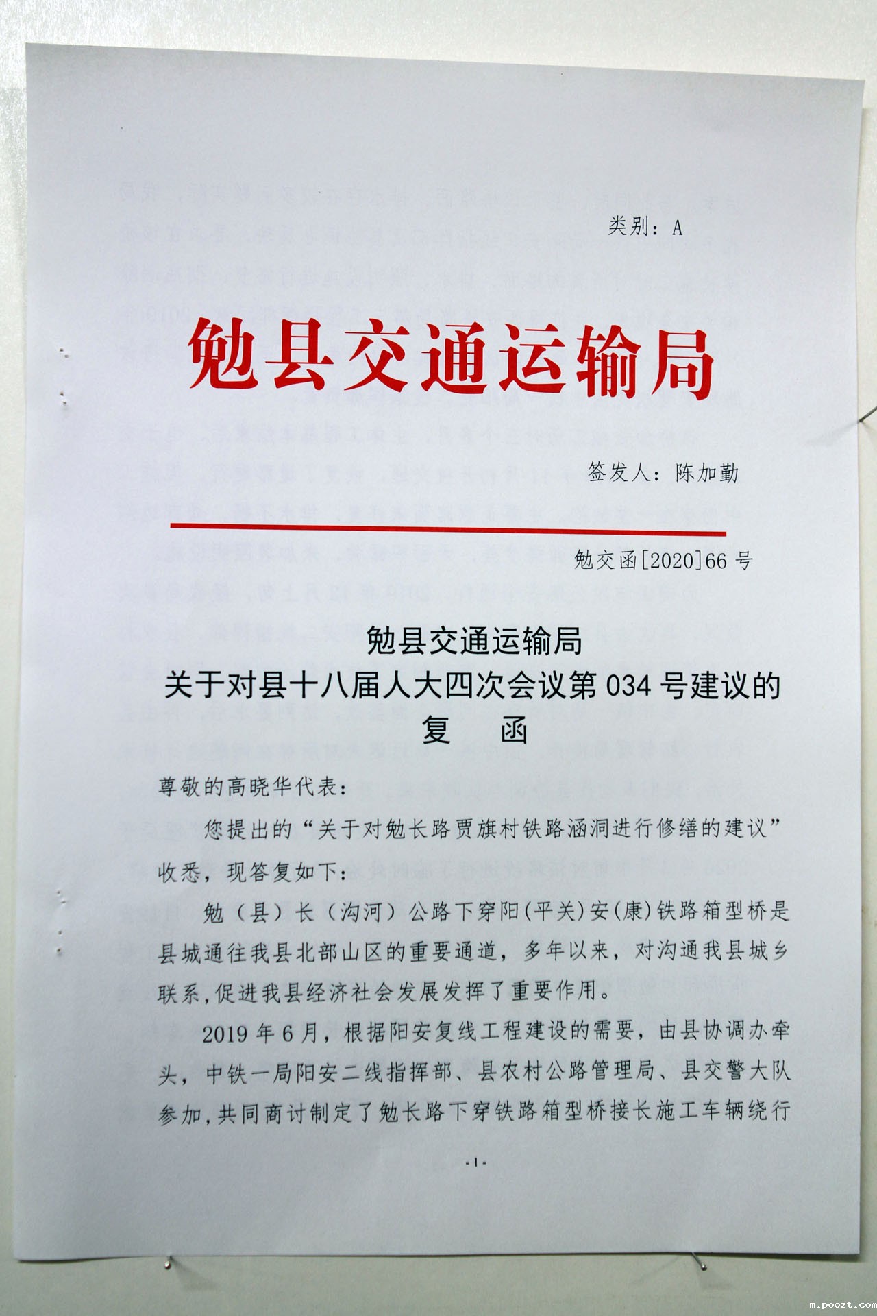 建 议:为了维护一方平安,缓解群众对政府的误解,请及时对勉长路贾旗村铁路涵洞进行修缮。