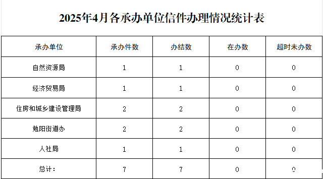 2025年4月各承办单位信件办理情况统计表