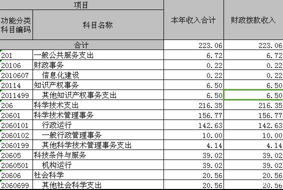 2017年度一般公共预算财政拨款支出236.11万元,按支出功能分,包括一般公共服务支出6.72万元、科学技术支出229.39万元(其中科学技术管理实务185.93万元,主要用于单位基本运行支出,包含单位人员经费支出;科技条件与服务39.02万元;社会科学4.44万元)