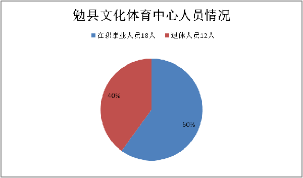 勉县文体中心为财政全额预算的正科级事业单位,截止2017年底,本部门事业编制人员18人,实有事业人员18人;退休人员12人。