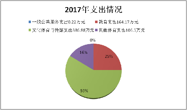 3、本年度合计支出657.77万元:其中一般公共服务支出0.22万元,教育支出164.17万元,文化体育与传媒支出386.88万元,其他支出106.5万元。构成情况如下: