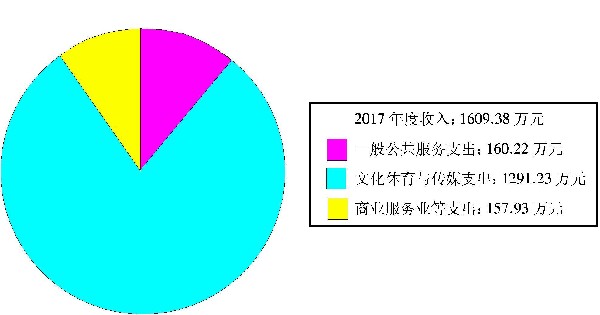 2、2017年度收入1609.38万元,其构成情况为:一般公共服务支出160.22万元,文化体育与传媒支出1291.23万元,商业服务业等支出157.93万元。