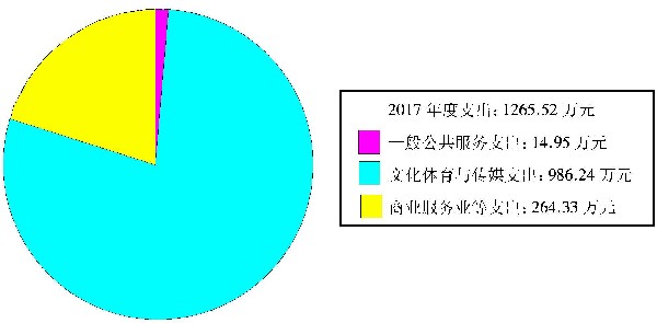 3、2017年支出1265.52万元,其构成情况:一般公共服务支出14.95万元,文化体育与传媒支出986.24万元,商业服务业等支出264.33万元。
