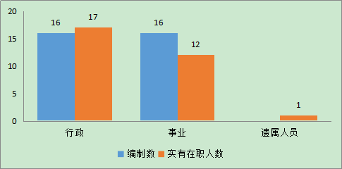 截止2017年底,本部门人员编制32人,其中行政编制16人、事业编制16人;实有人员29人,其中行政17人、事业12人。单位管理的遗属人员1人。退休人员12人已移交养老机构。