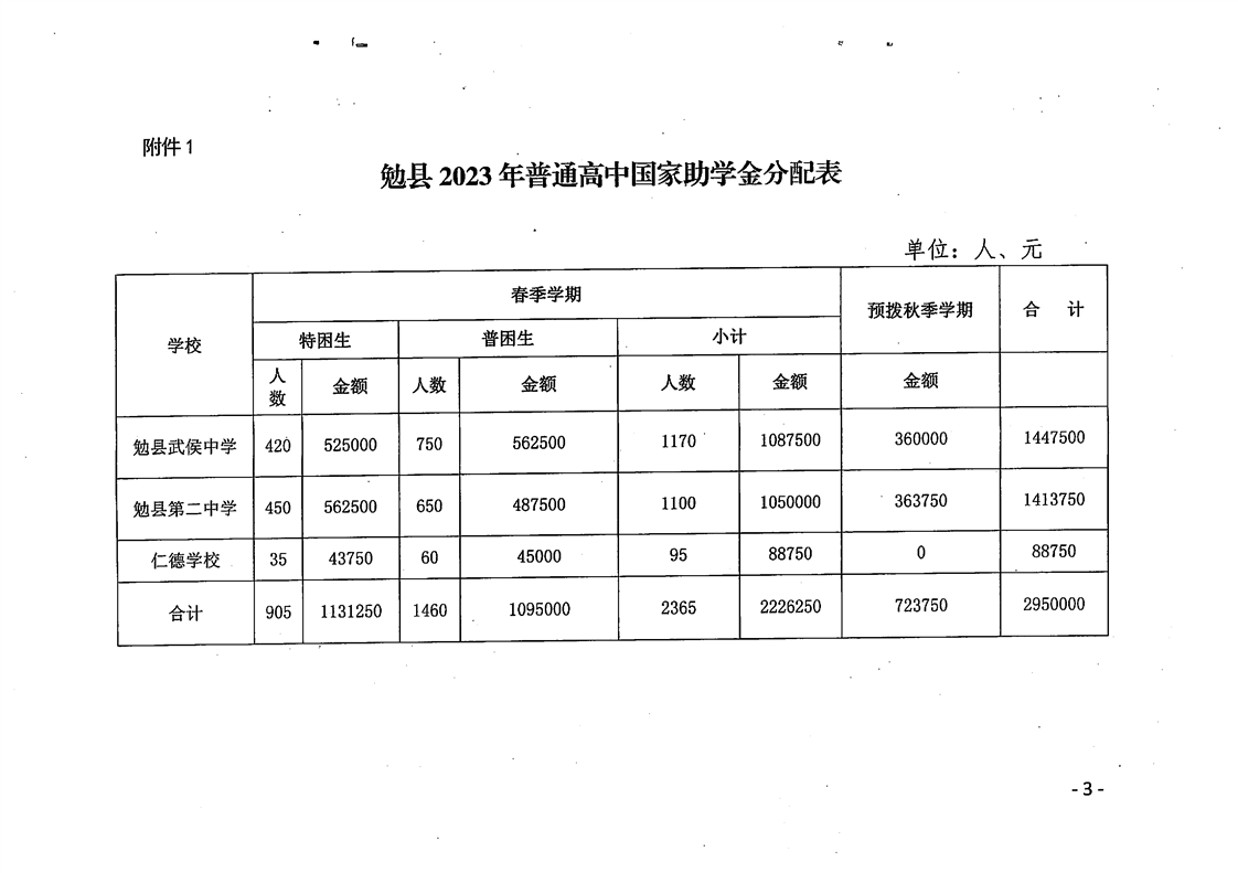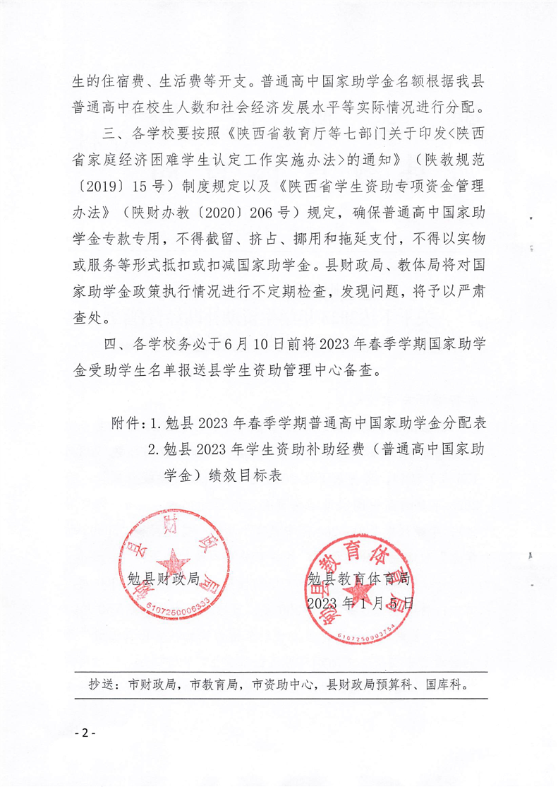 勉财办事[2023]5号 勉县财政局 勉县教体局关于下达2023年学生资助补助经费(普通高中国家助学金)的通知