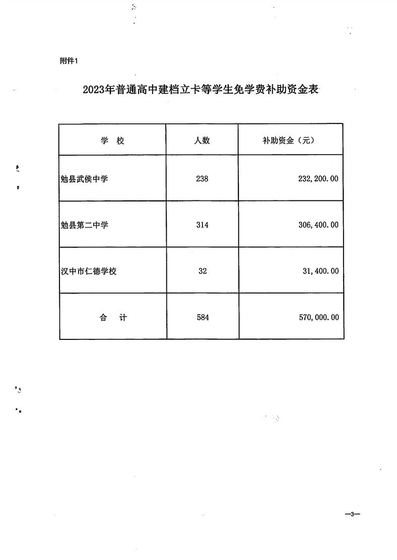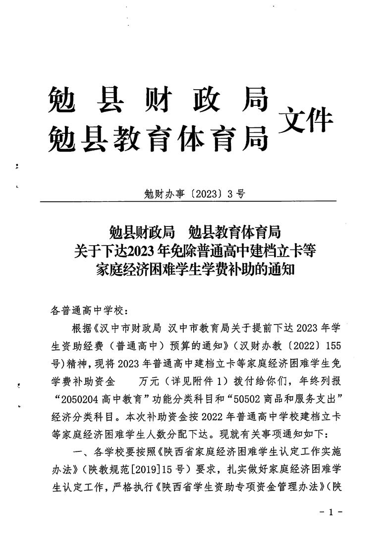 勉财办事[2023]3号 勉县财政局 勉县教体局关于下达2023年免除普通高中建档立卡等家庭经济困难学生学费补助的通知