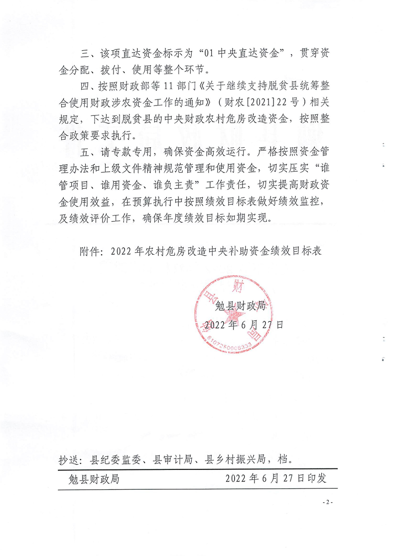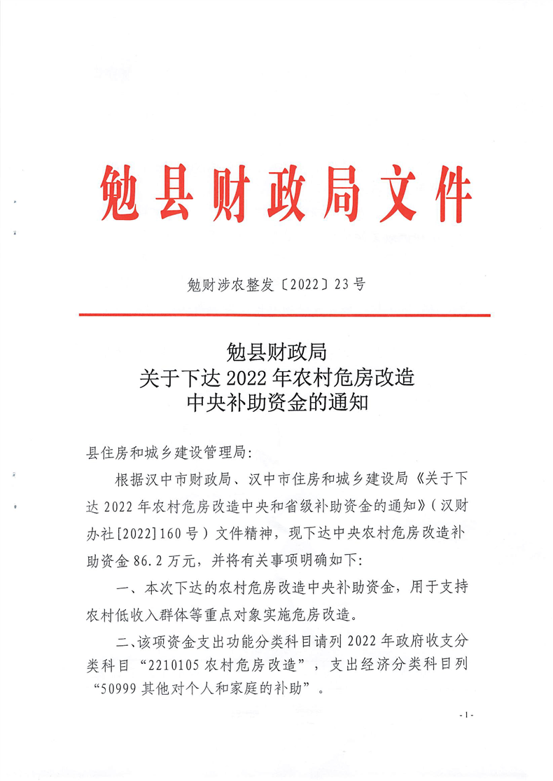 勉财涉农整发【2022】23号勉县财政局关于下达2022年农村危房改造中央补助资金的通知