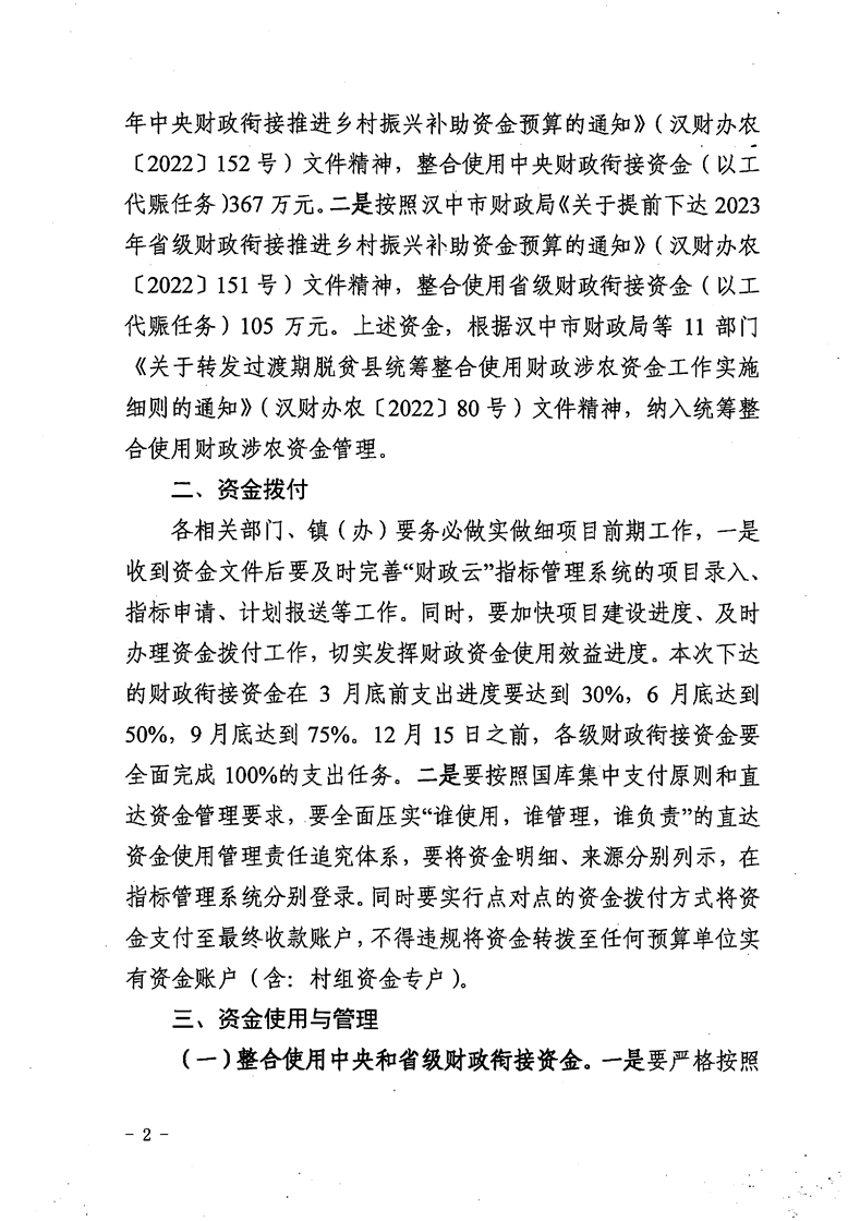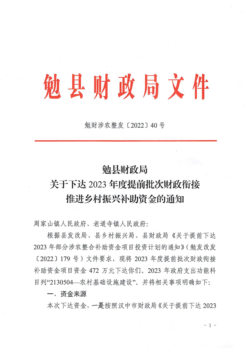 勉财涉农整发[2022]40号 关于下达2023年度提前批次财政衔接推进乡村振兴补助资金的通知