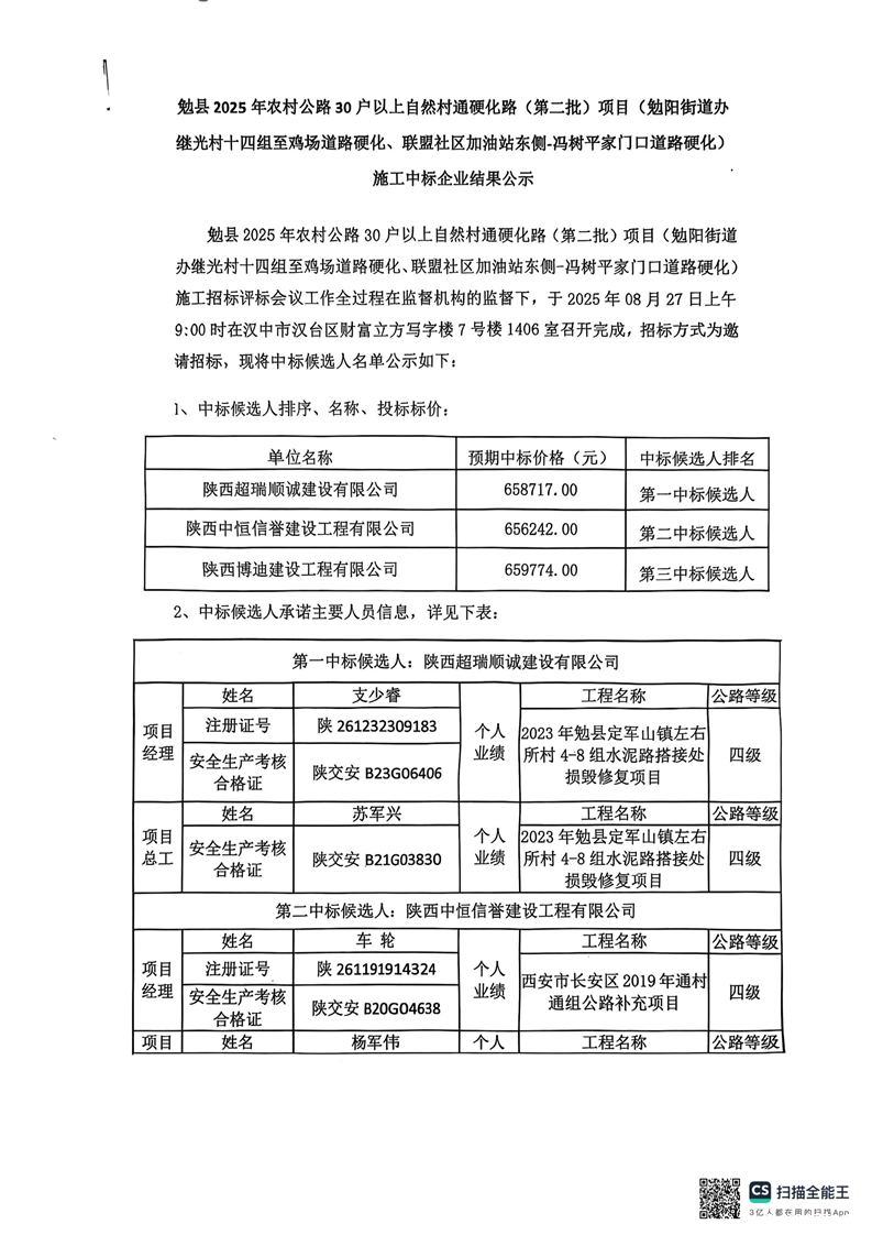 勉县2025年农村公路30户以上自然村通硬化路(第二批)项目(勉阳街道办继光村十四组至鸡场道路硬化、联盟社区加油站东侧-冯树平家门口道路硬化)结果公告