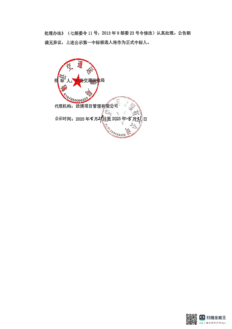 勉县2025年农村公路安全生命防护工程(第二批)项目(汉宁路、柿镇路、金泉寺村道、S309-祈家山)结果公告