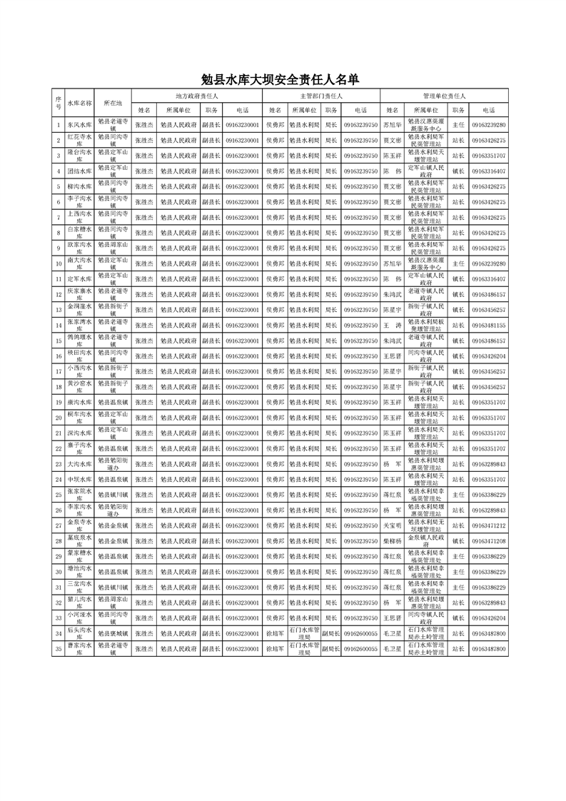 2025年勉县水库大坝安全三级责任人名单公示