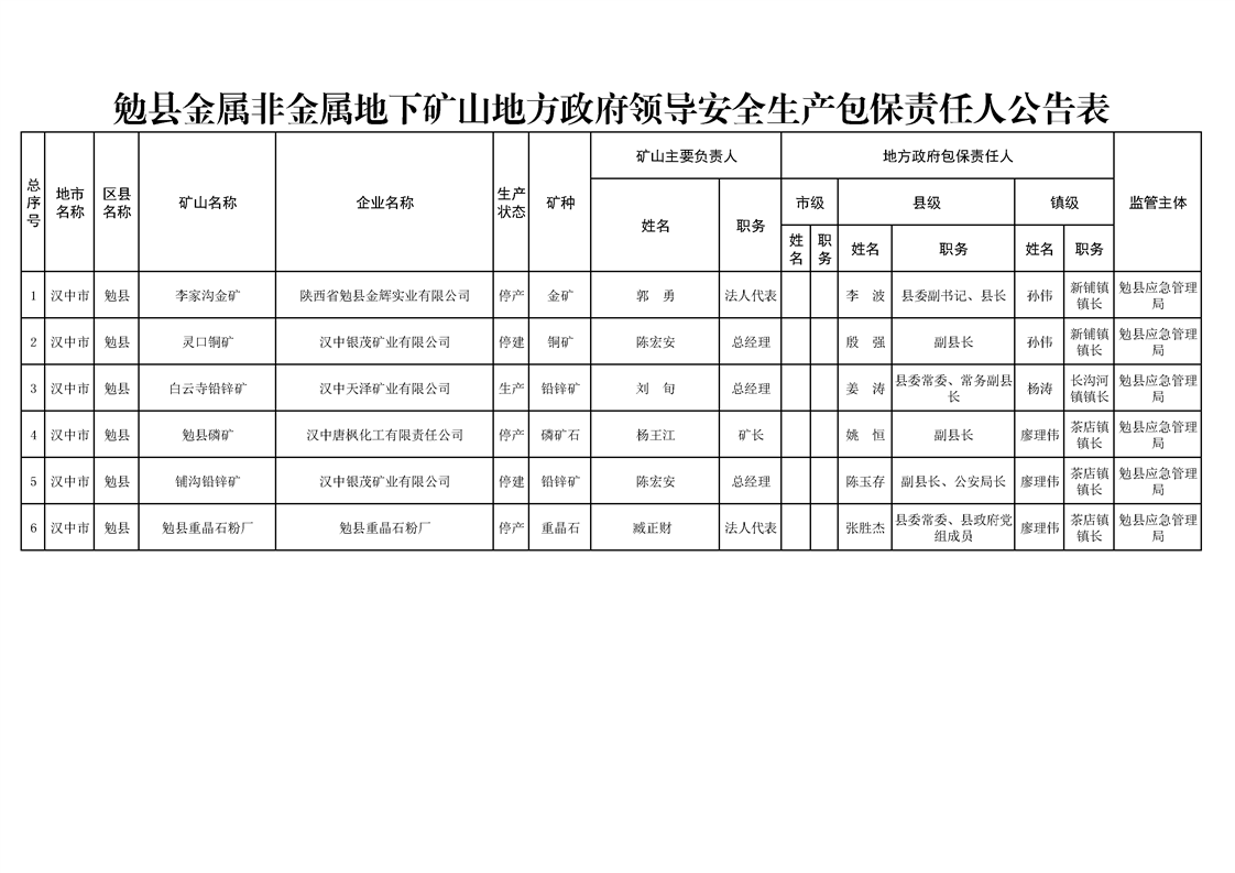 勉县金属非金属地下矿山地方政府领导安全生产包保责任人公告表