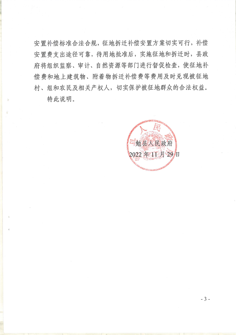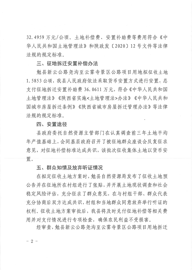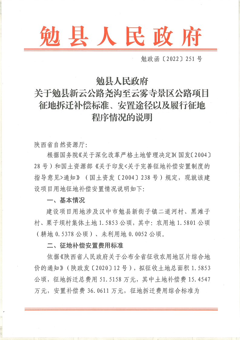 关于勉县新云公路尧沟至云雾寺景区公路项目征地拆迁补偿标准、安置途径以及履行征地程序情况的说明