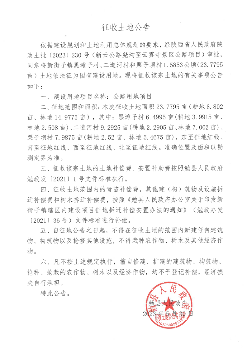 勉县新云公路尧沟至云雾寺景区公路项目征收土地公告