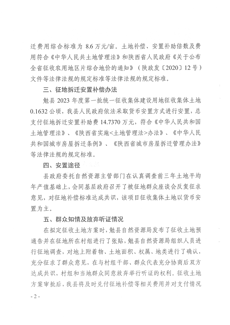 关于勉县2023年度第一批统一征收集体建设用地拆迁补偿标准安置途径及履行征地程序情况的说明